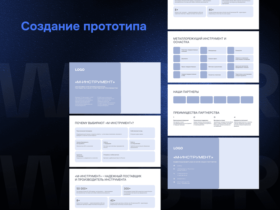 Работа началась с анализа уже существующих материалов. Поскольку ранее мы занимались редизайном сайта для «М-инструмент», у нас уже была готовая база, на которую можно было опереться. Мы взяли структуру сайта, тексты, визуальные акценты и общую логику подачи, чтобы не создавать новую систему с нуля, а развить уже существующую коммуникацию компании.