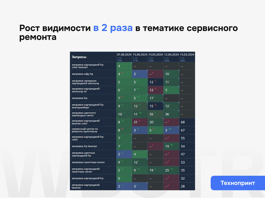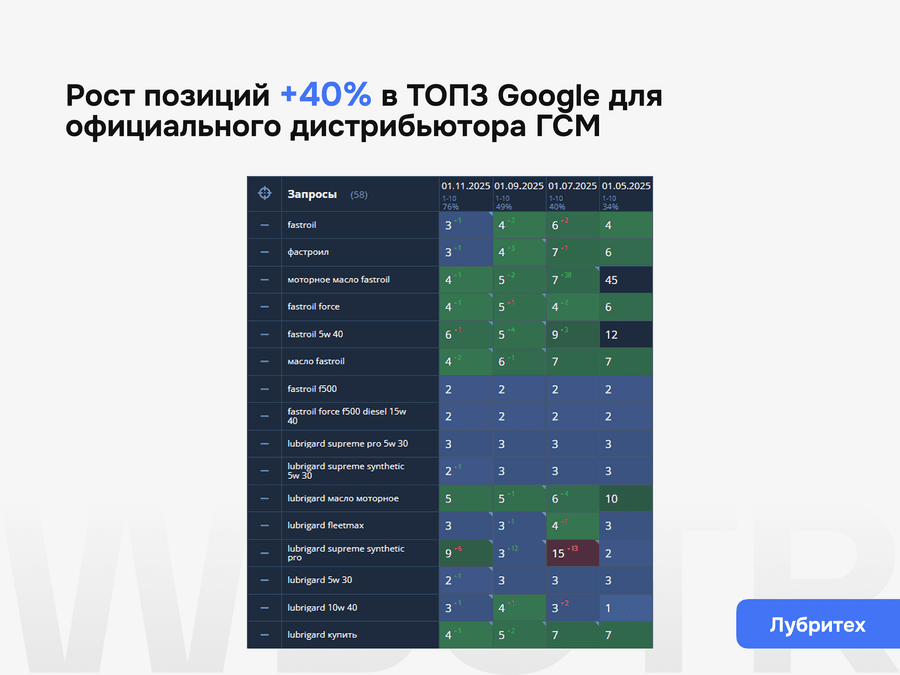 После базового усиления переходим к следующему уровню: расширяем структуру, усиливаем рабочие зоны и переводим проект в режим системного роста из поиска без потери управляемости внутри CMS. Если бизнес оценивает результат через стоимость лида, окупаемость, выручку или другие коммерческие метрики, приоритеты SEO также выстраиваются вокруг этих показателей, а не только вокруг роста видимости.